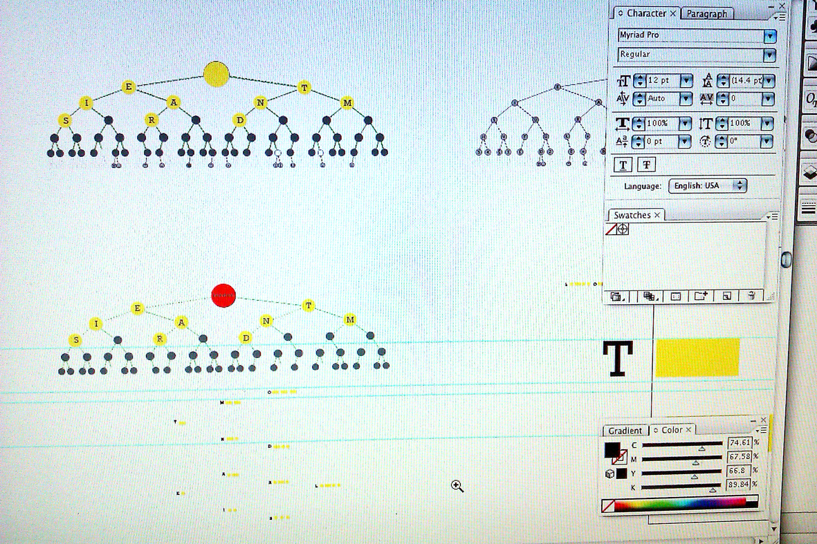 “The first approach was via Morse code, so in came the dichotomic search tree, unsatisfied I kept on researching and came across Chappe’s Telegraph which gave me the idea on the frequency of the transmission of a word but not necessarily attached to syllable cutting. It also made me think about the fact I wanted it to look like something that ‘dangles’ from a telegraph line.”