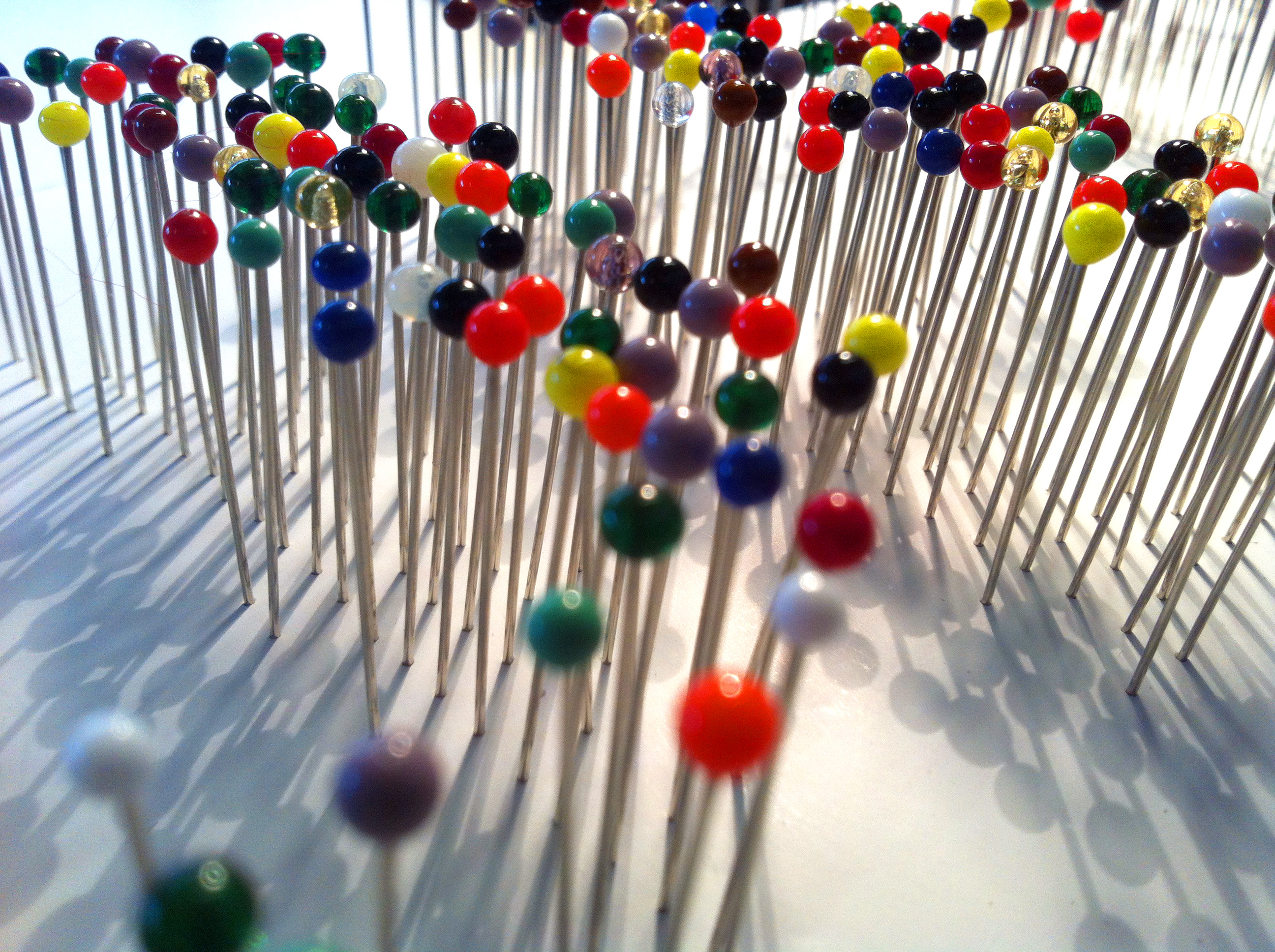 “The process of producing my concept involved placing the glass fashion pin heads in a modular pattern reminiscent of Alan Fletcher’s famous Reuters logo from 1965 and Damian Hirst’s spot paintings, in the form of the letters. I then removed pins from the edges of the letters to create a more informal shape, which in my mind represent the constantly evolving, always challenging London design scene.”