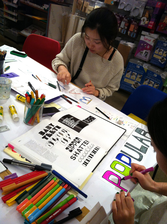Type Tasting went to Cass Art Islington, a perfect place to hold a workshop. Participants got away from the computer to get their hands dirty experimenting with typography and exploring its expressive qualities. We explored the topic of ‘creative London’ through typography, mark making and materials. The words created will be a part of Type Tasting with the London Design Festival at the V&A.