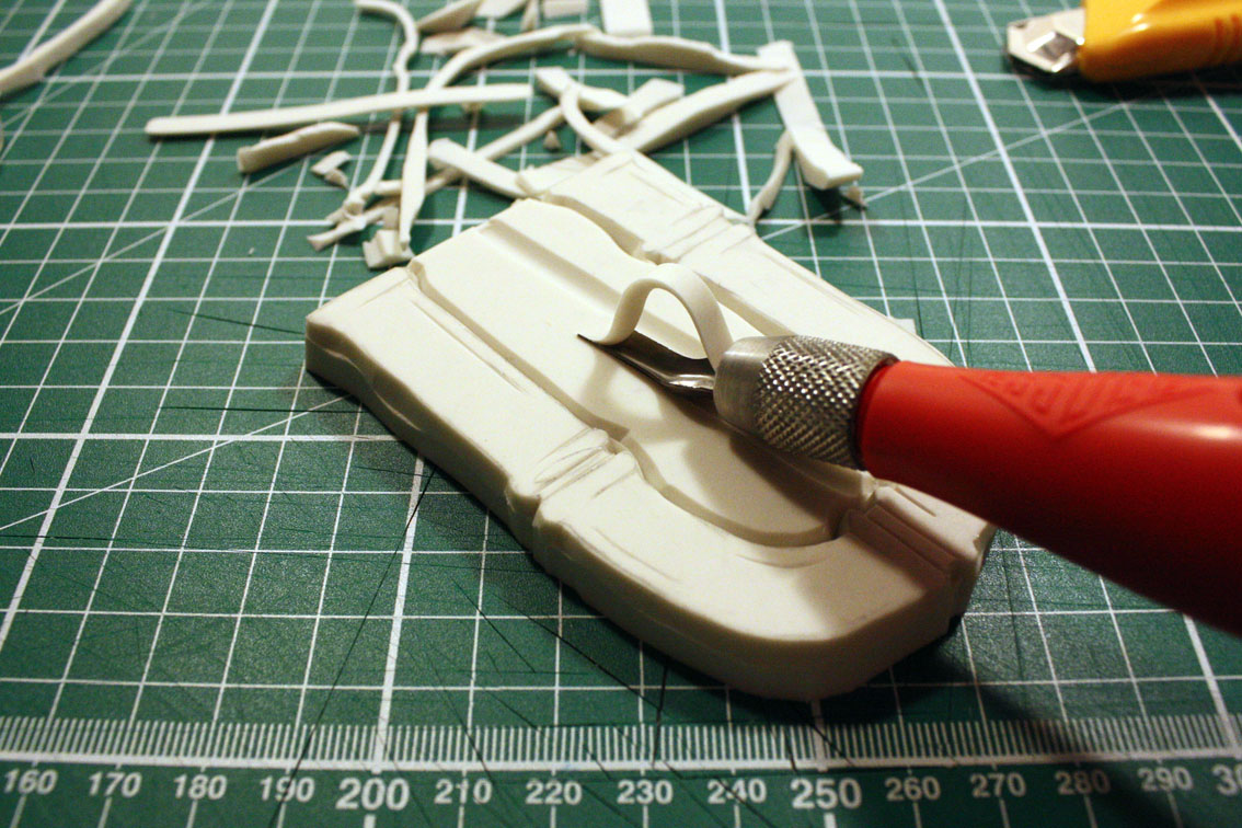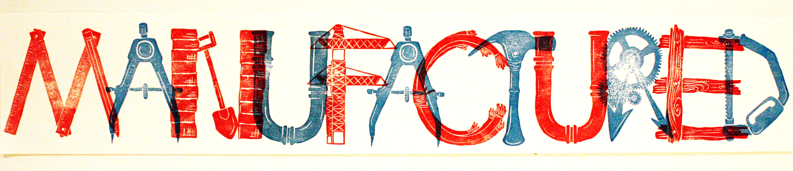 “I draw some components and tools of manufacturing as letters, then cut them out of lino as printing them would emphasise the repetitive nature of the manufacturing process.”