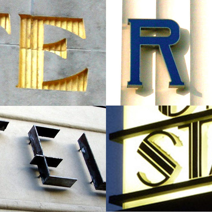 Above: Art Deco signs from New York (USA), London (UK), Melbourne (Australia), LA (USA). Below: Berlin (Germany), Las Vegas (USA), Brisbane (Australia), Moscow (Russia).