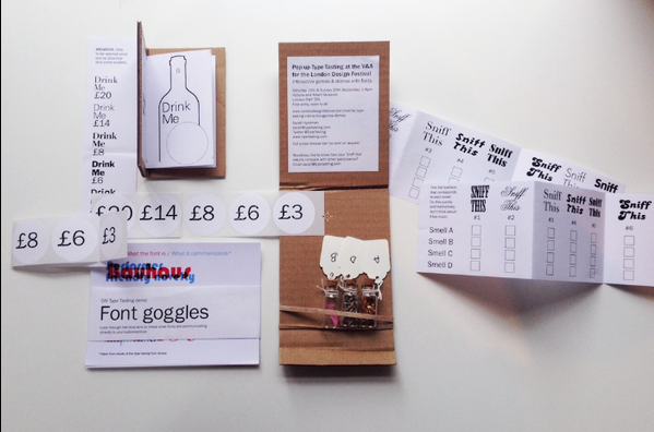 Sarah creates bespoke Type Tasting events and team building days. Recent Type Tasting events have included booze and font matching, coffee and typeface pairing, and a live version of the online Type Dating Game. Sarah has created previous Type Tastings for Pick Me Up at Somerset House, Huddle at Mindshare UK with Monotype and South by Southwest in Austin, Texas. She also runs workshops for the D&AD.