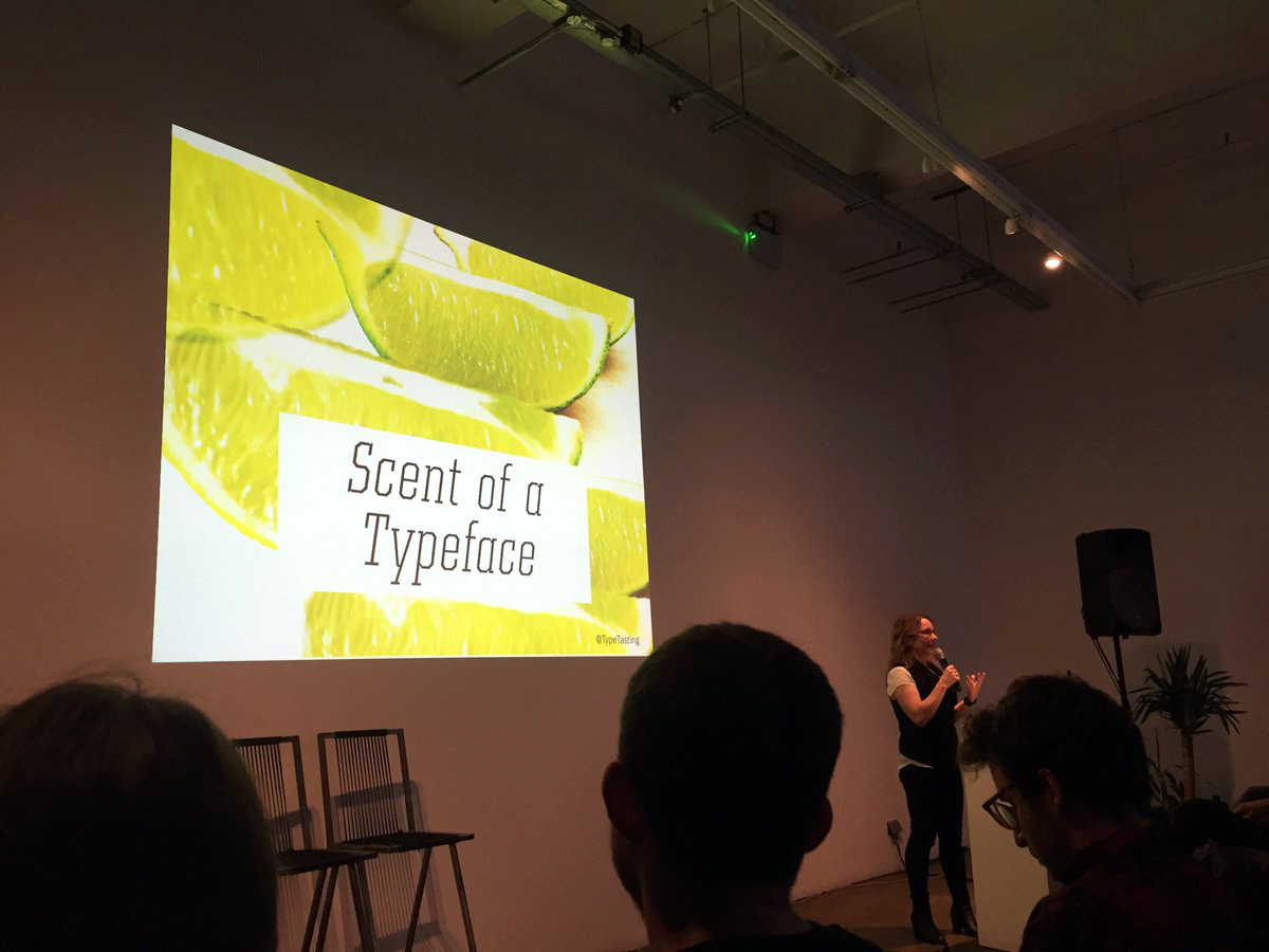 The members of the audience were also invited to take part in ‘font sniffing’ experiments, these are a part of an ongoing project to map smells to typefaces to create a type/smell etymology system. They took part in an experiment to induce grapheme-smell synaesthesia, experienced how a typeface can nudge their experiences to change how something smells or how much they will enjoy it. We ended with the kiki bouba effect, first noticed in the 1920s, which maps the sound of words to visual shapes, and can be used as a type classification system and is worth considering when naming products.