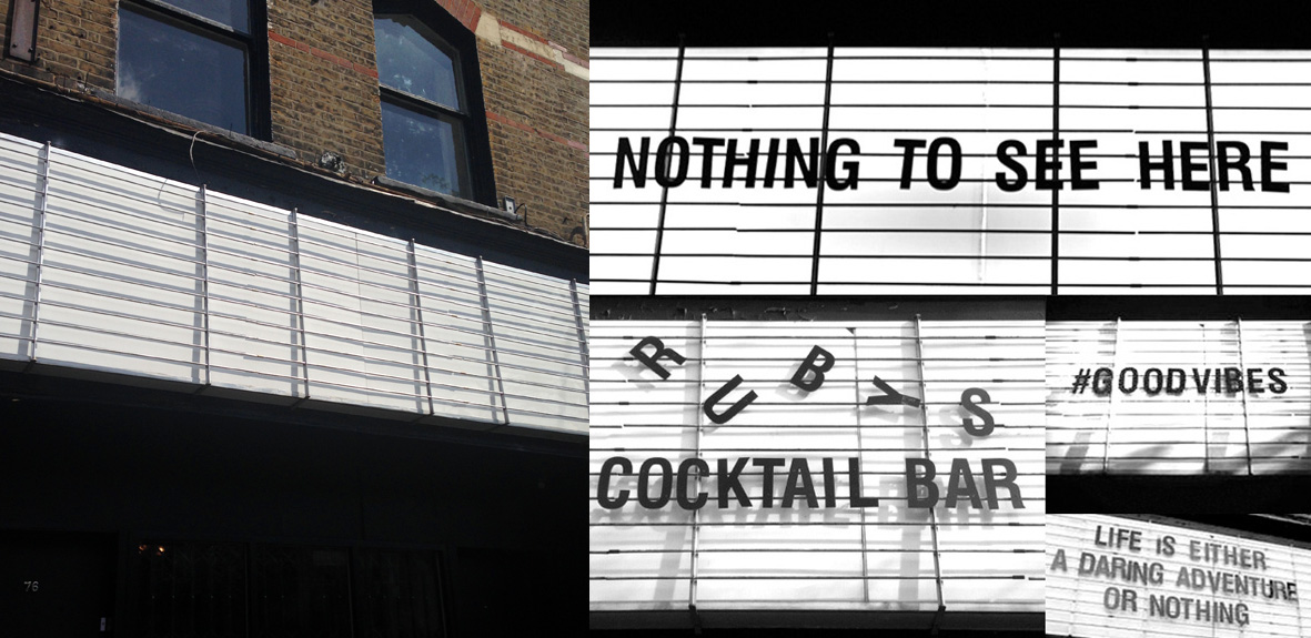 Ridley Road Market is going corporate as the vernacular, hand painted signs bursting with personality and humour are being replaced by vinyl lettering in the specified market typeface. On the last safari we arrived at Dalston Kingsland Station to see an empty metal frame where its sign used to be. And change is inevitable over Ruby’s Bar and Lounge as their chatty cinema sign nearly always has something new to say.