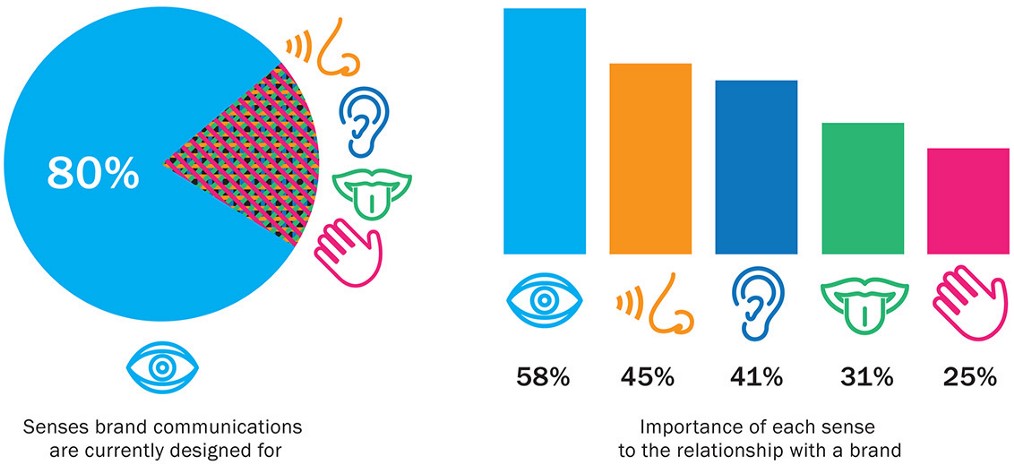 We live in a visually dominant world, it is estimated that over 80% of all brand communications are designed for sight alone. But less than half of our brain is involved in processing what we see and research shows that all of our senses are important in creating brand relationships.