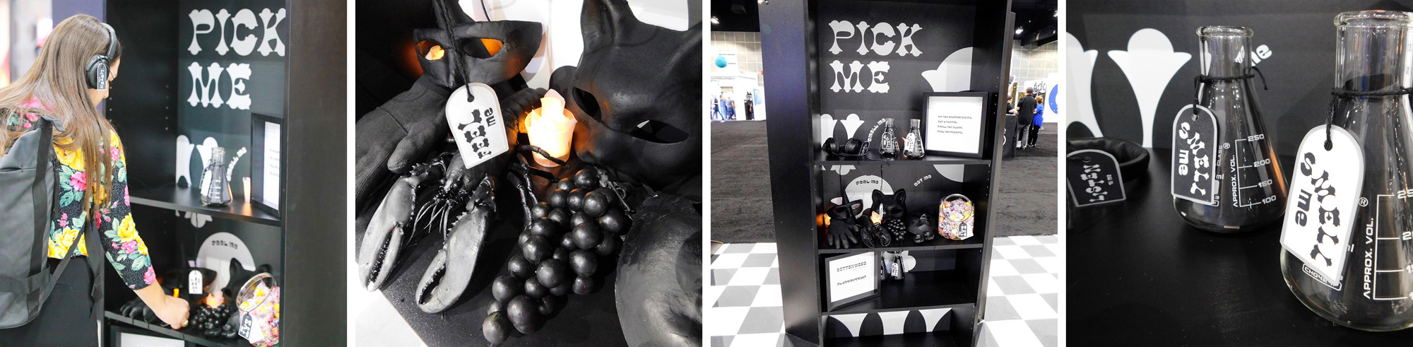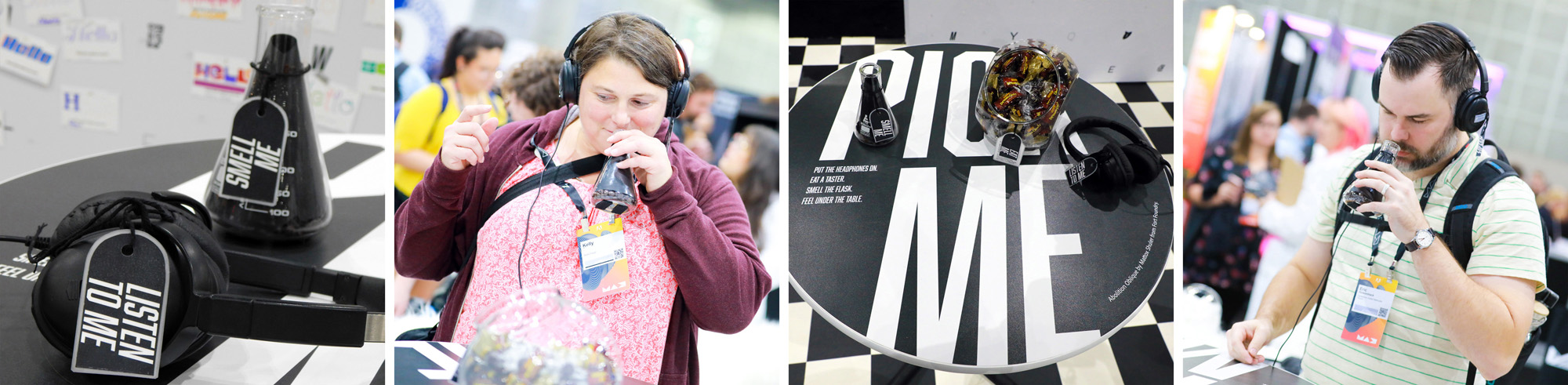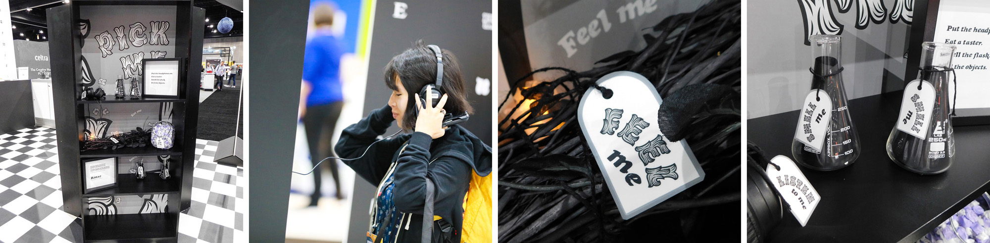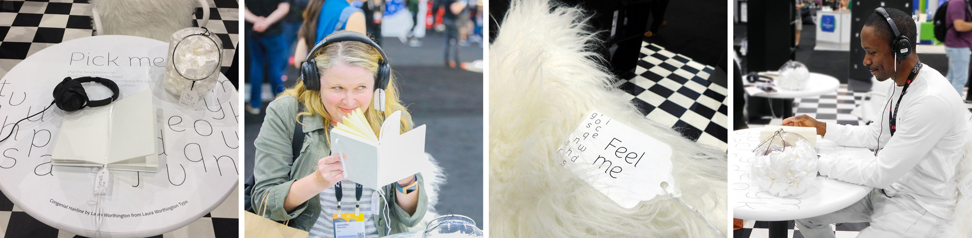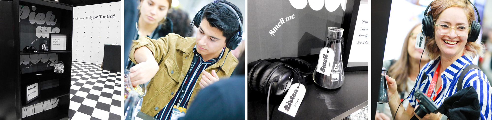 Visitors were immersed in the mood of different typefaces through all of their senses. At each station they were invited to put on headphones, to smell a scent in a jar or by flipping the pages of a book, to eat a small taster and to feel a texture. Each set of stimuli was designed to bring a mood to life in the participant’s imagination. There was curiosity and intrigue as the first visitors arrived and they were soon returning with groups of friends saying “you have to try this”.