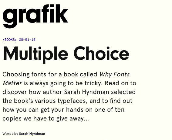 In celebration of the official launch of Why Fonts Matter in the US today: Grafik asked how I chose the typfaces for Why Fonts Matter. “Choosing fonts for a book called Why Fonts Matter is always going to be tricky.”