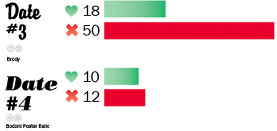 “Some proof: When graphic designer Sarah Hyndman asked women to choose between dating nine fonts including Franklin Gothic, Futura Light, Helvetica, and Arial bolded round, 20 percent of women said they’d pick Franklin Gothic as their typographic beau, the winner by a landslide. I know it sounds weird, but let me explain. Hyndman’s dating question is part of Tasting Type, a series of online experiments she’s been performing to gather data on how typography impacts human perception.”