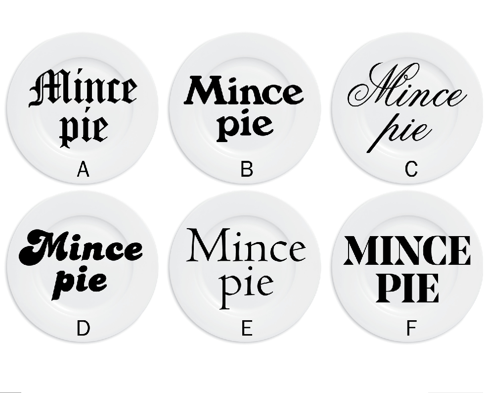“Would eat a) traditional looking font, Dickensian, fruity, icing sugar. c) trad. appeal, . d) no, looks fun, 70s, but don’t get feeling of quality, little filling. f) could go either way: cheap rubbish, or potentially high quality, large and deep filled. b and e no opinion.”