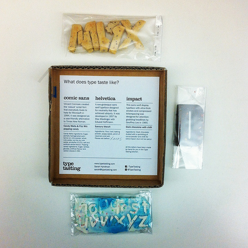 In celebration of the official launch of Why Fonts Matter in the US today: Creative Review ran a piece on the pop-up Type Tasting at the V&A for the London Design Festival. “Type Tasting’s series of multisensory experiments, for me, turned typography on its head.” Natalie Kelter